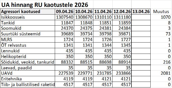 Ukraina, laupäev, 11. aprill 2026. Täna on tähelepanu keskpunktis rinde ümbruse võtmepiirkonnad. Põhisuund oli Huliaipole. Hulaiapole suunas on saabunud Vene mereväe jalaväe täiendused. Venemaa positsioonide taandumine piirkonnas, mida täheldati aasta alguses, näib olevat peatatud. Peaaegu iga päev registreerisime 35–65 sõidukist koosnevaid kolonne. Toimus ka BMP/BTR-klassi soomukite aktiivne varustamine. Kokku mitte vähem kui 50 üksust.  Kostjantõnivka suunas tungivad Vene väed igast küljest peale, kuid kannavad kohutavaid kaotusi. Vaidlusalused alad on suured. Lõmani suunas on Vene väed Jampilis veidi taandunud, olles seal lüüa saanud, kuna Ukraina vägedel õnnestus pärast kaotatud tugipunkte taastada.